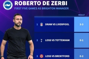 体育资讯4月1日讯 热刺官宣德泽尔比成为球队新帅,据德转数据回顾,这名教练上一次执教英超球队(布莱顿)时,前五场联赛一场未胜,战绩仅为2平3负。