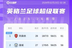 体育资讯2月23日讯 英超第27轮,热刺1-4阿森纳,最新的积分榜形势如下。